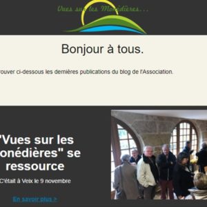 Vues sur les Monédières lance une newsletter. Objectif : tenir les adhérents informés des publications du site web et des actualités de l’association. Sa diffusion sera progressivement étendue aux acteurs et partenaires du…